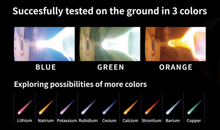 人工流れ星は材料を変えることで青と緑とオレンジの3種類が実現できている。(提供:ALE)