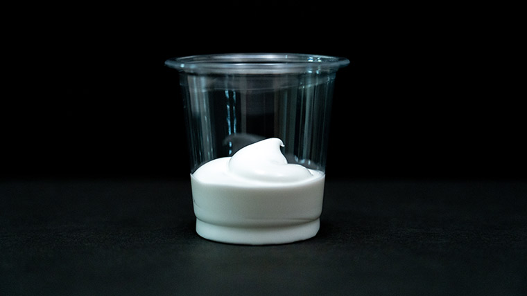 掬う際にスプーンにかかる抵抗感と、垂らした際の流れていく感じがほぼ一緒だった。乳酸菌飲料も3000超スピードも同じ様な軌道で流れて落ちて行った。次に同じ勾配の板の上から流してみた。