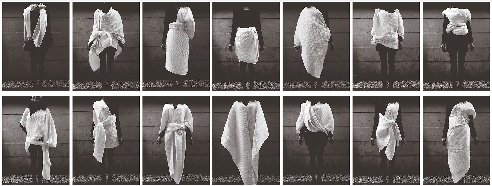 デンマークのアーバンデザイナーであるヤン・ゲールの『人間の街──公共空間のデザイン』(北原理雄訳、鹿島出版会、2014/原著=Cities for People, 2010)を一通り読みつつ、広場という人と環境が最もピュアに接続される場所で、ずっと模索してきたことをアウトプットしてみようと試みた。MADAME Tを参考にすると、設計するうえで寸法を限定的に入れている特徴を発見した。通常の衣服だと、身頃・襟元・袖口など、各パーツに寸法が入るが、MADAME Tは大判の布にプリーツ加工が施され、一寸のスリットが1カ所に入っているだけ。限定的であり、同時に衣服として成立する最低限の箇所だけに寸法を入れることで、着る人の意図が関与する余地を残しつつ、衣服として成立させている。デザイナーのコントロールを限定的にしたことで、着る人とともにある衣服となり、人の数だけ着方を展開する衣服となっていた。そこから着想を得て、広場と身体の関係をつくる環境を、限定的な寸法だけで成立する状態を模索した。