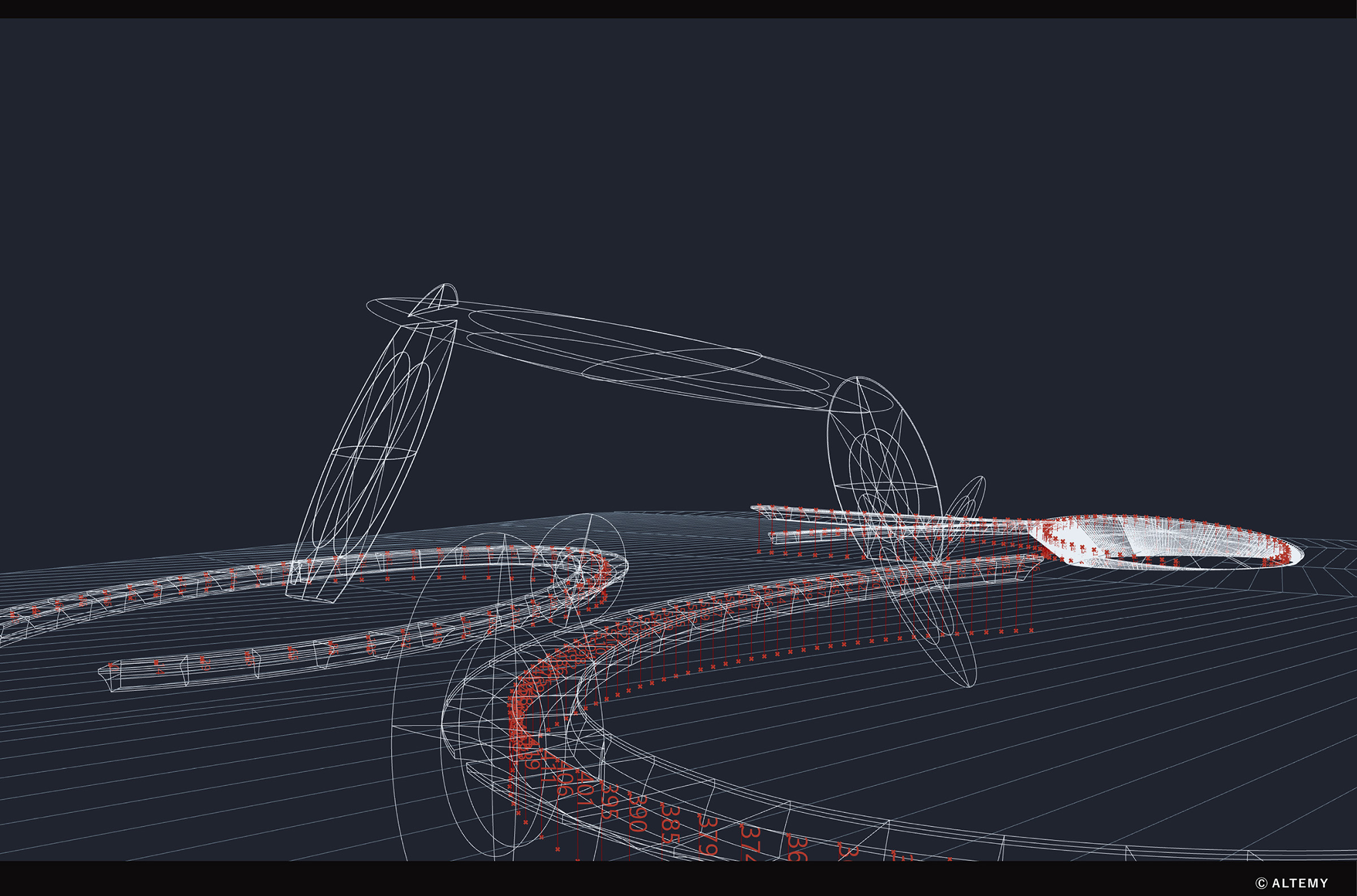 この広場ではすべてのオブジェクトをランドスケープと彫塑の間にあるような、斜めになったオブジェクト群で構成し、最も低い高さ(GL±0)と最も高い高さを決め、それらの間をつなぐ寸法は他律的につくられることを意識した。低い場所・高い場所をつなぐストロークの斜面勾配を4.8%以下(斜めに座っても不快に感じない勾配)に抑えつつ、コンピューテーショナルデザインによって恣意的に決めていった間が生成されるようデザインを決めていった[fig.3]。