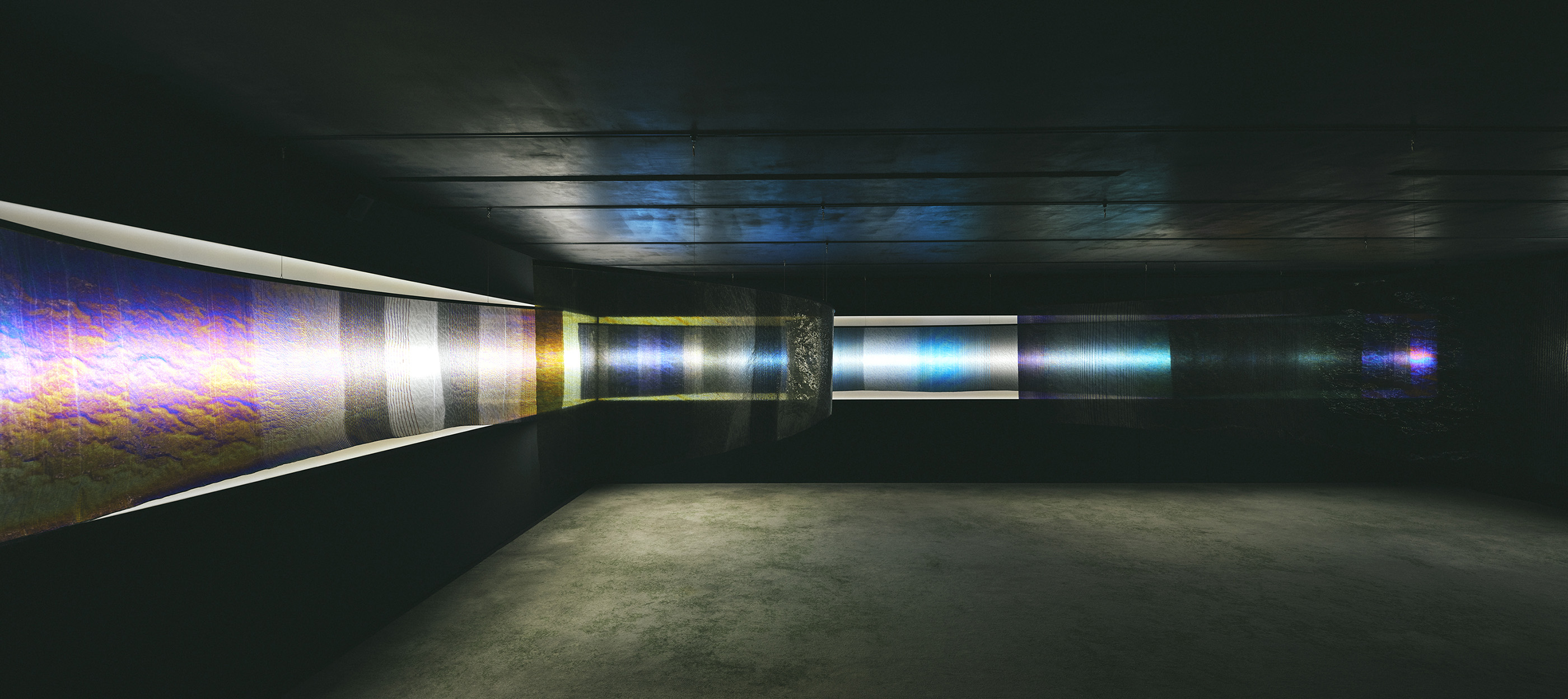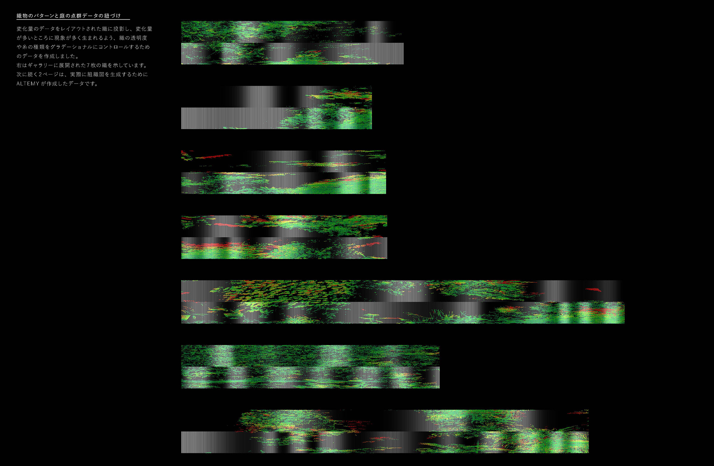 同時に、細尾の工房に終日滞在し、西陣織の成り立ちをインプットした際、西陣織の内部構造にとても魅了された。ルーペで織物の中を覗くと、表層の意匠からは想像もできないほど、立体的構造に支えられて西陣織ができている。その内部にこそ、アーキテクチャが存在しているように思えた。そこで「西陣織の内部構造がそのまま意匠に現れ、物質的な織物というよりは現象的な環境装置を目指し、織物を通して、日本庭園の動的な“状況”を感じられる織物をつくりたい」と着地した。全体的な曲面の展示構成は、人が回遊することで色彩が変化していくダイナミックな庭の変化を表し[figs.6, 7]、織物の経糸による張力で緯糸がたわみ、細かな波形によって色が移り変わる様相は、庭の日々の細かな変化を表している[fig.8]。これらは1年間通して庭を3Dスキャンすることによってビジュアライゼーションされた、庭の動的なデータ「間のデータ」を作成し、3次元な展示空間への落とし込み/織物の組織図に翻訳したことで実現している[figs.9, 10]。