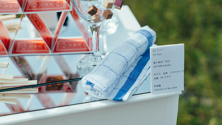 鏡を土台にしたことで、空の青が映る。これで「強透明」を表現した。ただこの日は薄曇り で青空は出ていなかった。これが「EXクリア」をテーマにしたアート作品ということになる。それでも「EXクリア」を感じないという場合は最終手段がある。