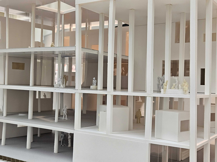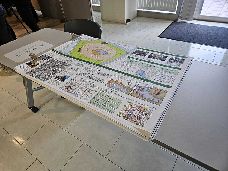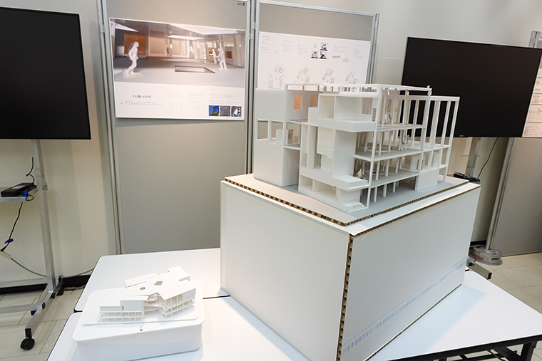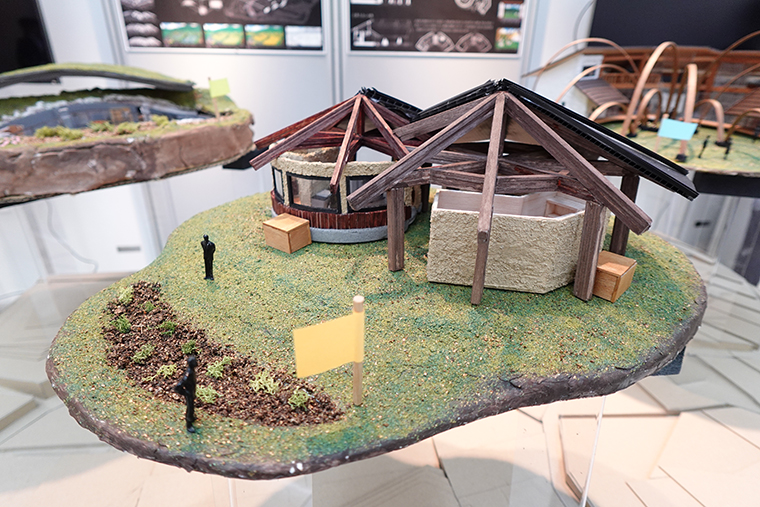 展示室に足を踏み入れると、立体模型や平面資料が目に入ってきました。見せ方の表現も審査の対象とのことで、どう見せるかをギリギリまで調整しています。