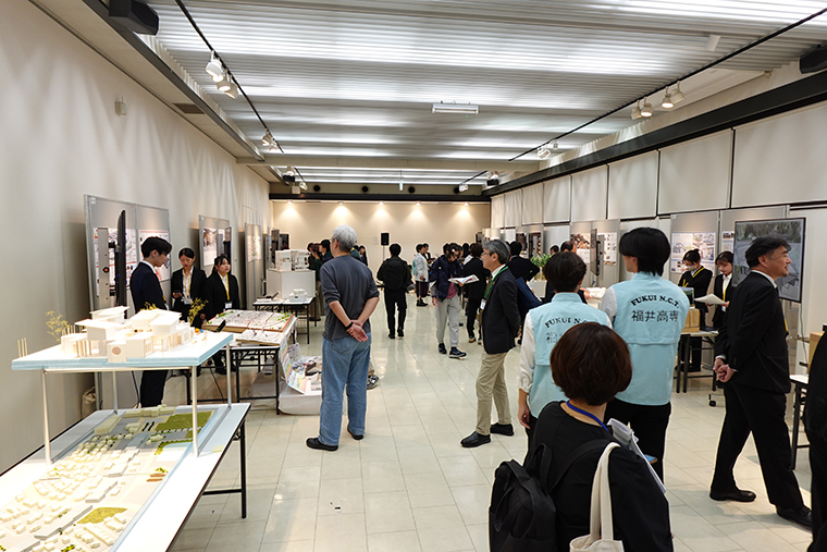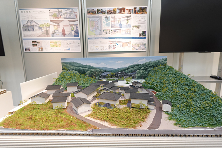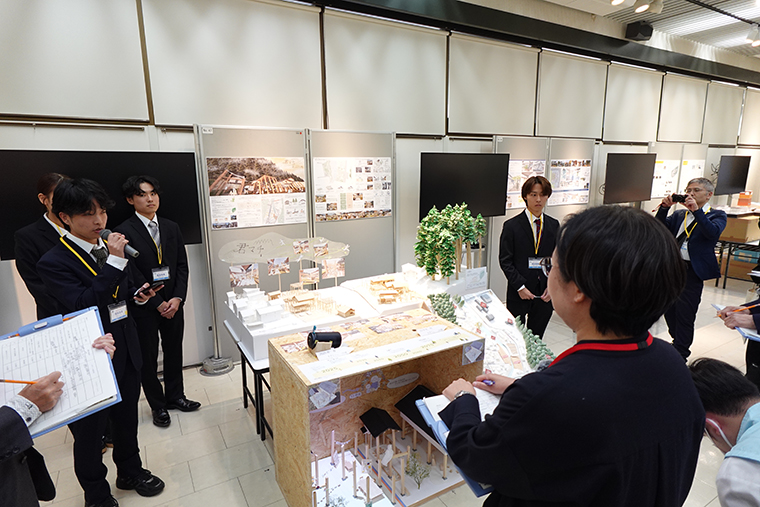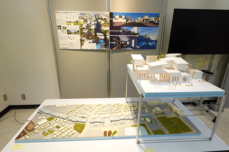 模型を見て佇まいに惹かれたのが、石川高専の「すれ違いの共生」です。集合住宅の住まいに宿など公共機能を追加し、配置計画や共用動線設計、住戸とセカンドスペース(離れ)の関係、プライバシーと交流を両立する建築の工夫などが盛り込まれています。担当した上野さんは今回初めての参加。計画はひとりでつくりこみ、模型やプレゼンテーションは先輩やクラスメイトに手伝ってもらったといいます。目の前にあったら足を踏み入れてみたい印象的な作品でした。