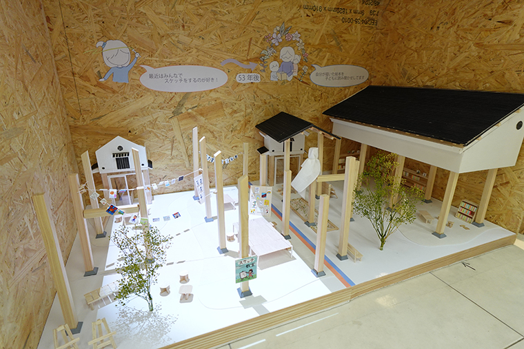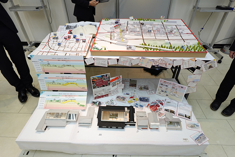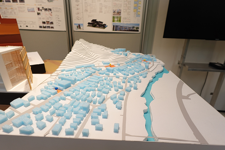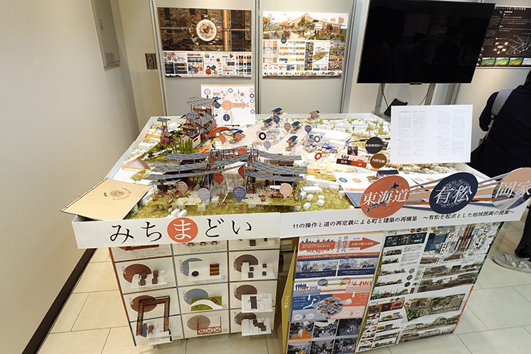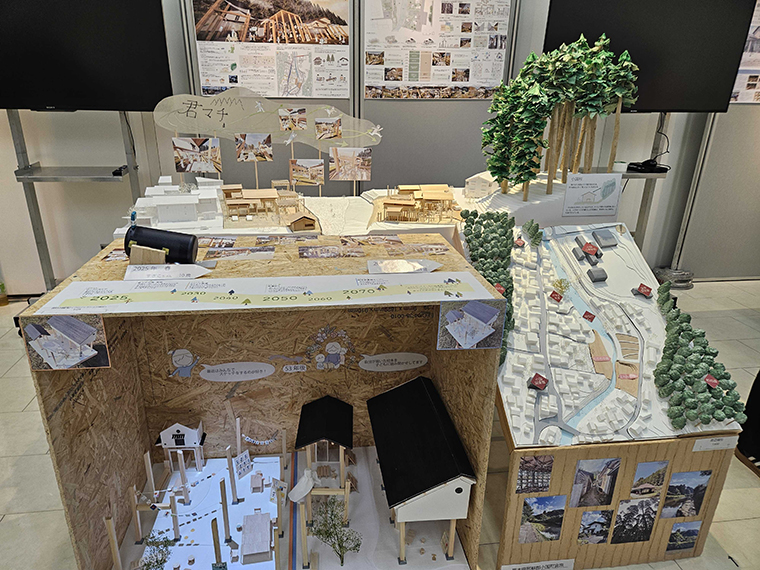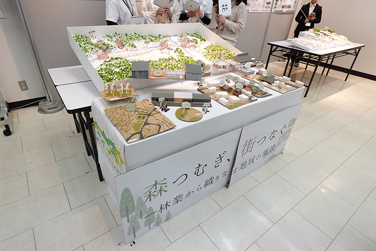 愛知県の豊田高専のチームが取り組んだ「森つむぎ、街つなぐ」。豊田市稲武地区に着目し、既存の建物のリノベーションと新築による間伐材利用のサイクルを作ることで林業を再び地域の軸に戻す提案です。手前には1/200で表現された住まいやショップ、オフィスなどの模型もあり、そこで実現する建物や空間の使われ方のイメージが鮮明にうかびます。