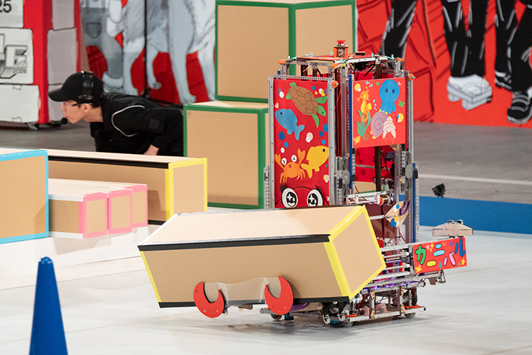 産技高専(荒川)も毎年非常に高い技術をロボットに盛り込む「こだわり派」のチームです。前試合と同様に、あらかじめピラミッド形の高いゲートを作り置きしておき、細いロボットアームでボックスを器用に挟んで土台のボックス(緑色)上に載せて搬送するアプロ—チを採用。ここまでの試合では320cmのゲート構築とゲート通過に成功しましたが、本試合でも安定した戦いを見せ、300㎝のゲートづくりに成功し、355点をゲットして勝利を収めました。