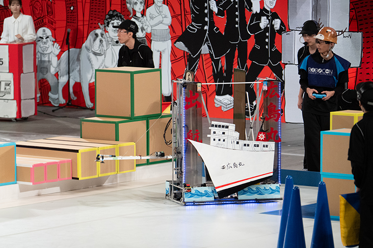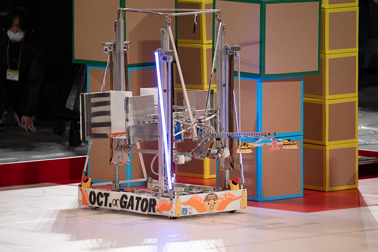 準々決勝の第四試合は、少人数ながら堅実な作戦で得点をゲットしてきた富山高専(射水)と、最高420cmという高さのゲートを構築できる実力派の熊本高専(熊本)の一騎打ちとなりました。富山高専はタコを、一方の熊本高専はロブスターをモチーフにしているロボットで、見た目も面白かったです。