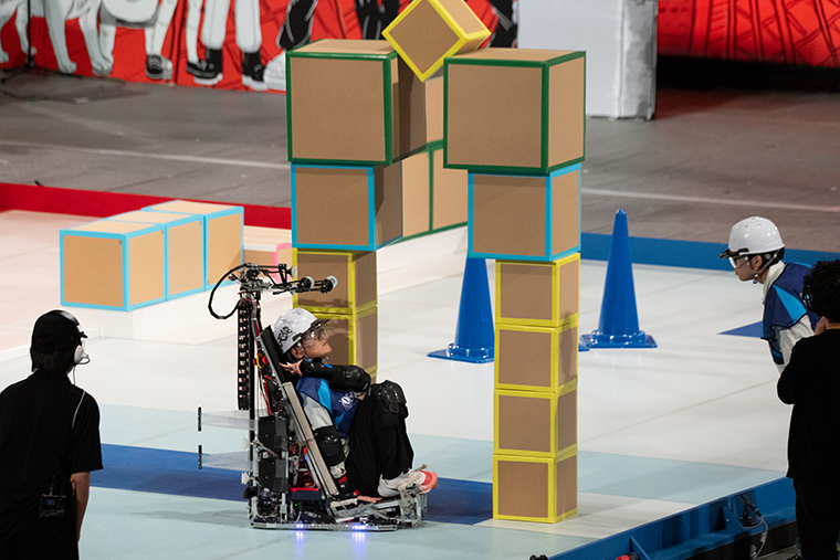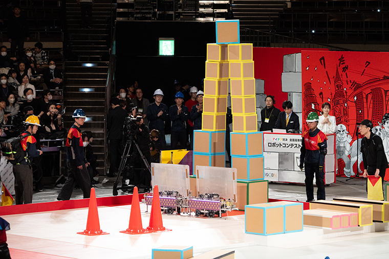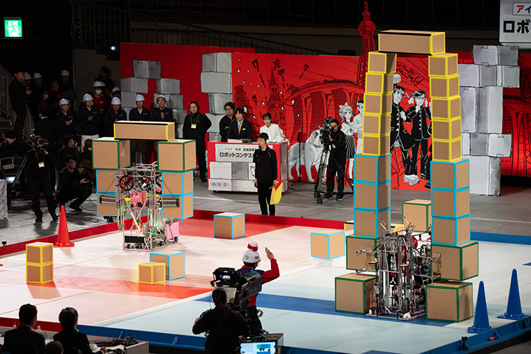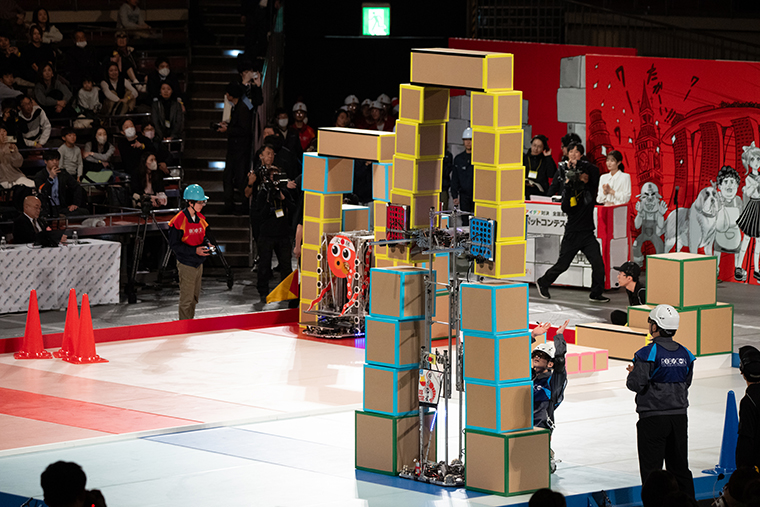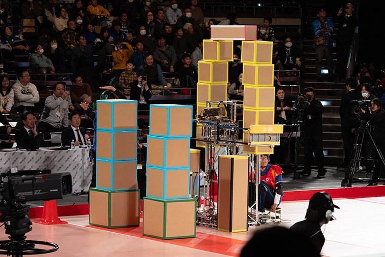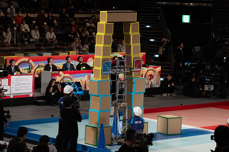 対する熊本は、素早くパイロンを1つ取って、その後に共用ボックスエリアから水色の箱と細長い箱を搬送。同校は2つの直方体を縦に置くE回収にチャレンジ。その柱を、さらに高い土台にリフトアップし、なんと残り10秒のタイミングで420㎝という本大会の最高記録となるグレートハイゲートの構築に成功しました! 高さボーナスの50点が加算され、得点は475点に。しかし残念ですが、あと一歩及ばす。最終的に旭川高専に勝利の女神が舞い降りました。