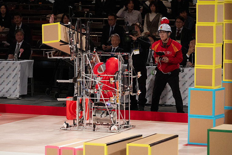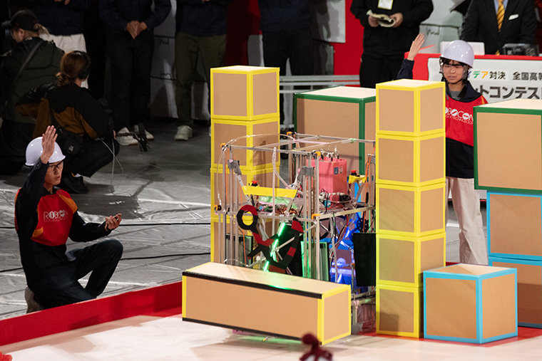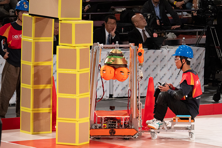 ピラミッド型のゲートを土台の箱に載せようとする産技高専のロボット。この瞬間は見ているだけでヒヤヒヤする。審判も慎重に見守っているようだ。