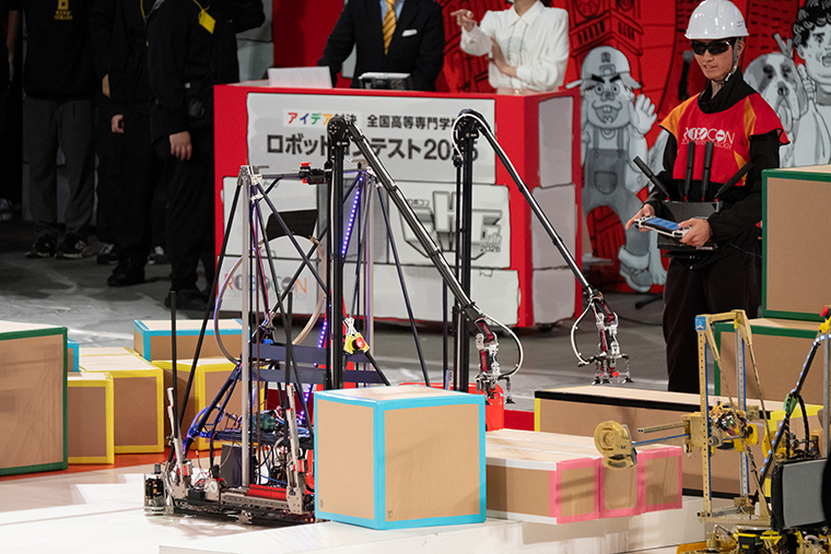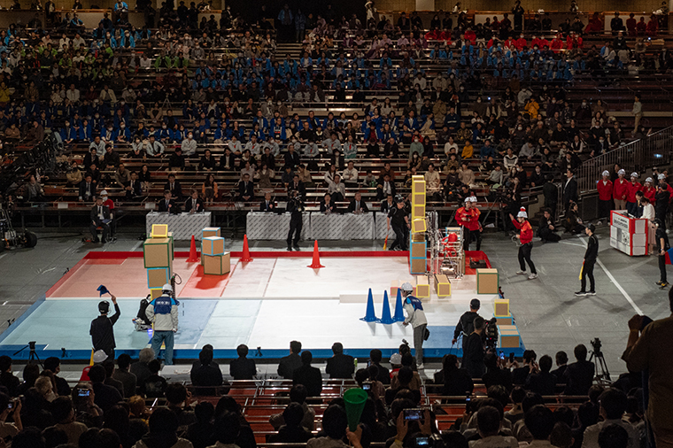 作戦を変更した熊本高専はアームで直方体の箱を取るときに、不覚にも箱を落としてしまい、強制リトライで競技時間をロスしてしまいました。そのあとに水色の箱を搬送し、2つ柱にリフトアップ。320㎝のゲートを構築して、本当にギリギリの時間で台車の通過に成功しました。手に汗を握るような展開でしたが、最後は20㎝高いゲートづくりに成功した同校に軍配が上がりました。産技高専は僅差で負けてしまったものの、本当に良い戦いを繰り広げてくれました。