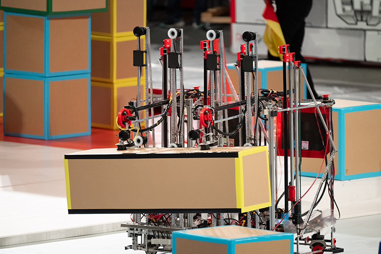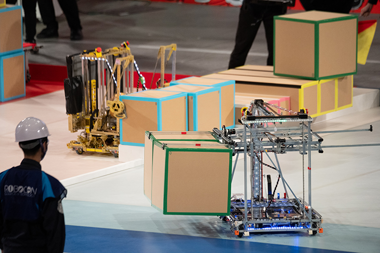 共有ボックスエリアにある箱は数が限られているため、それらを取れるかどうかでゲートづくりも変わる。写真は都城高専のロボットが箱を搬送しているところ。