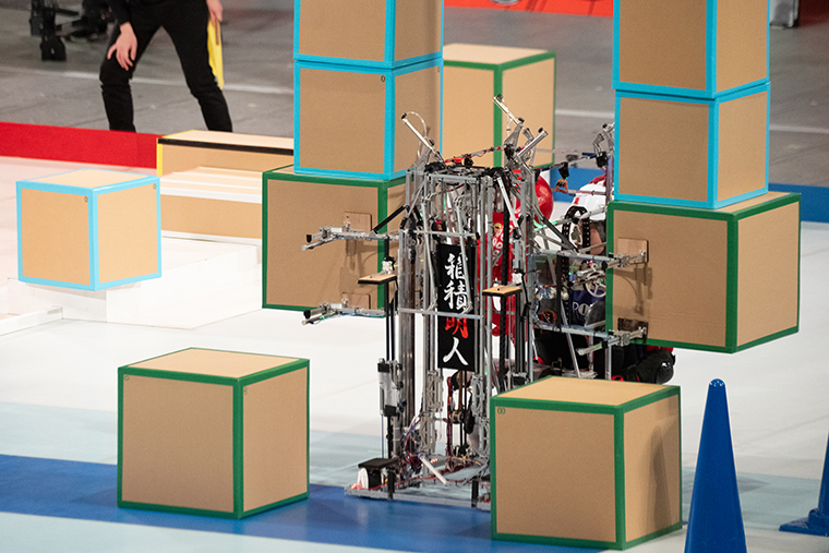 奈良高専はハイゲートのために長い直方体を立てる通称「E回収」にトライして柱をリフティング。段階的に高いゲートを立てる方式は他校でも見られた。