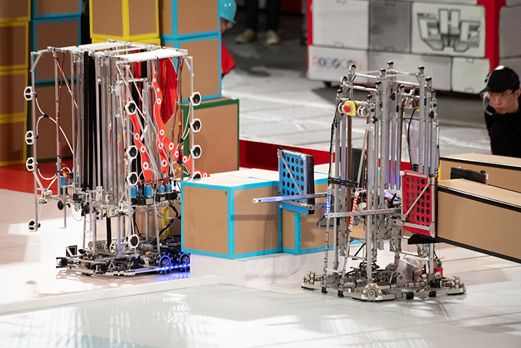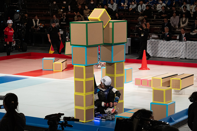 箱積みは高いほど高得点になりますが、崩落リスクと作業時間を取られてしまいます。戦術的には、お題のようにゲートを高く積み上げて高得点を一挙に狙うのか【★写真13】、あるいはゲートの高さは妥協して周回で堅実に得点を稼ぐのか、そのあたりのバランスを上手く取ることが試合の勝敗に繋がったようです【★写真14】。