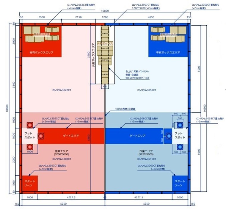 ロボットが自在に動き回る競技フィールドには、対戦相手ごとに青と赤ゾーンがあります。各ゾーンには下の図のように、作業エリアとゲートエリア、自チームだけが箱を取れる専有ボックスエリア、3つのパイロンが置かれたエリアのほか、競技相手も箱を取れる共有ボックスエリアがあります【★写真3】。