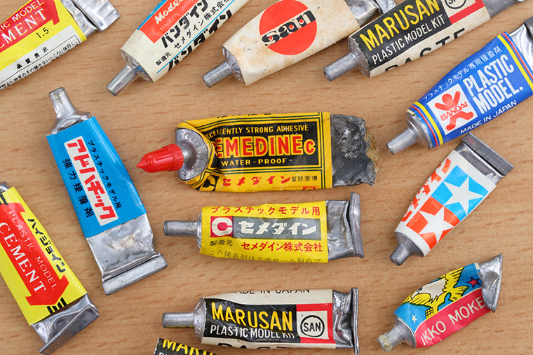 松井:今日も何本か持ってきました。僕と同世代の人間なら、接着剤のロゴやチューブ&袋の形状だけでも何時間も話せますよ。私の少年時代、近所には模型用接着剤を売っている店がなかったので、プラモデルに同梱されていた接着剤が命綱でした。とにかく神経質に使う性格だったので、足りなくなることはありませんでした。