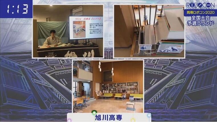 校舎の広さに定評のある旭川高専キャンパスをフィールド(出場校中最大)に5台のロボットにより繰り広げられる、卒論提出リレーの模様をお届けします。フィールドの広さはもとより、ロボットの台数が増えるとその分調整・連携も難しくなりますが、手すりを上る⇒次のロボット投げ渡す⇒ながーい廊下を高速で走り抜ける⇒次のロボットに(2階から)投げ渡す⇒先生のもとに運ぶ動作を通じて、卒論は時間内に先生のもとに届きました。卒業おめでとうございます!