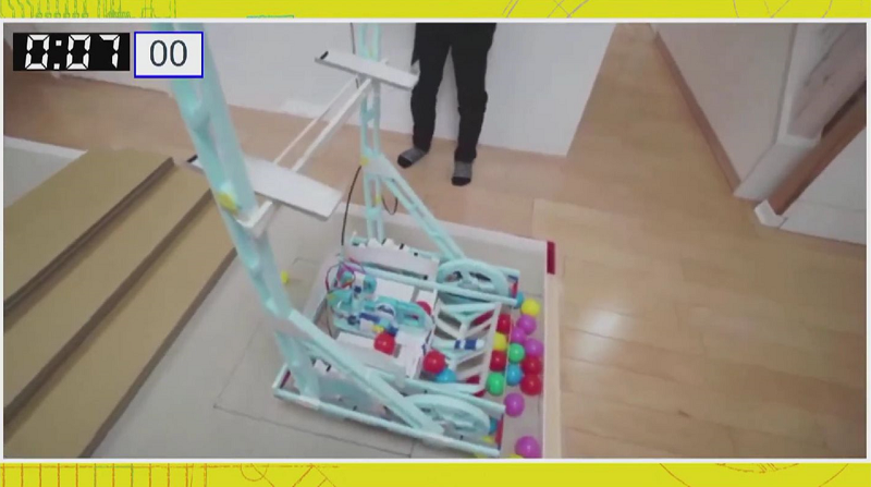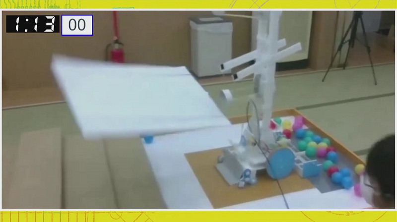 クジラをモチーフにした中川さんのロボットは、ボールを運ぶ機構をクジラの潮吹きに見立てました。射出口は1か所だけで、潮を上下にのばして1段ずつ確実にボールを入れていきます。この機構は糸の巻き上げにより収縮する仕組みになっており、安定したスムーズな運搬が可能です。見事95秒でミッションコンプリート(6つの窓、2つのテラス全てにボールを運ぶ)しました。