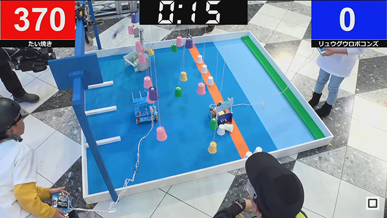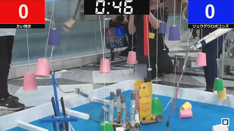 花守:まず第1ラウンドの第1試合のたい焼きチームからご紹介しましょう。各メンバーが上手に役割を分担しながらサンプルを持ち帰っていますね。金君のロボットは4筒の飛び道具(https://youtu.be/l2mbabZfnv0?t=3869)があり、コップを狙い打ちできます(https://youtu.be/l2mbabZfnv0?t=4008)。最も高いコップは1mの位置に吊るされているので、何か弾のようなモノを飛ばして落とす必要があるのです。
