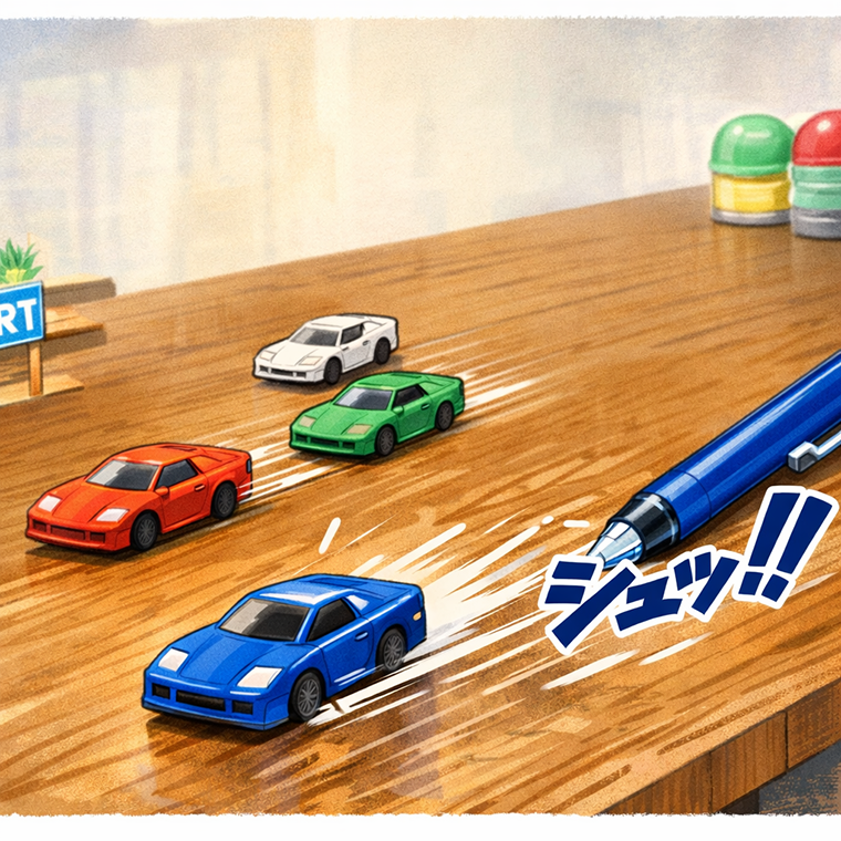 障害物を避けながら、ノック式ボールペンを弾いて先に一周したほうが勝ち!