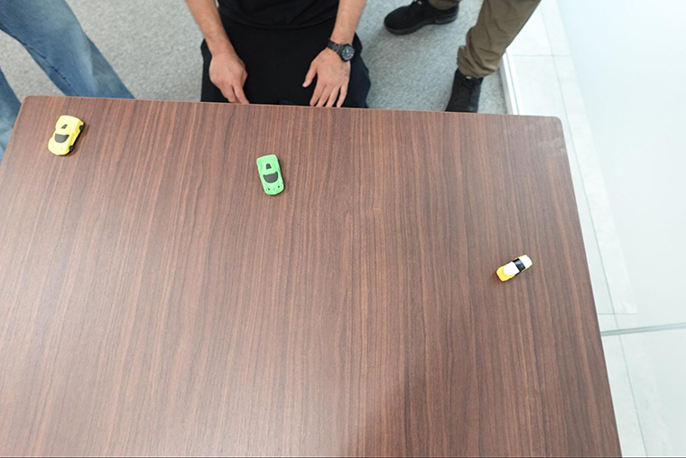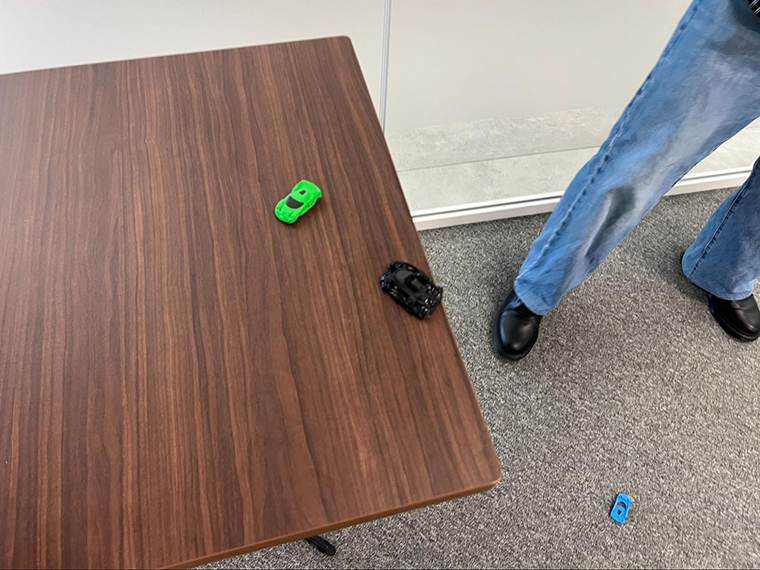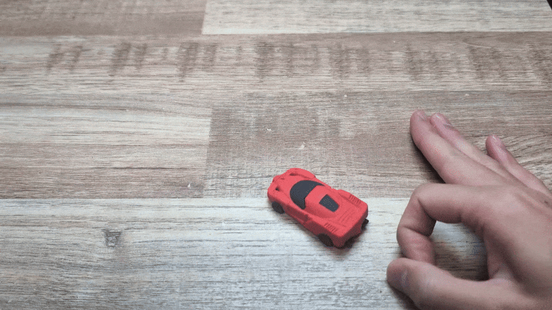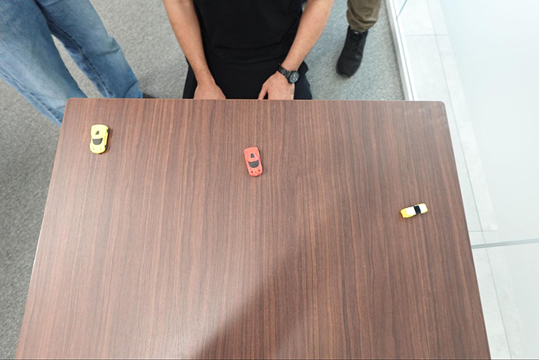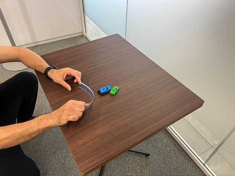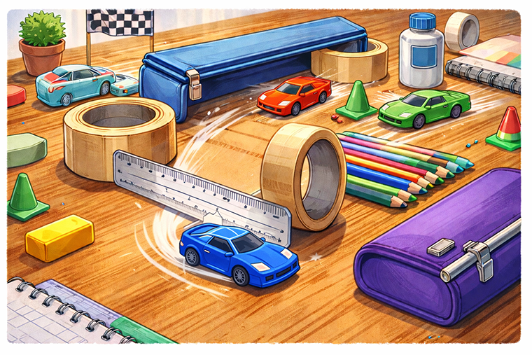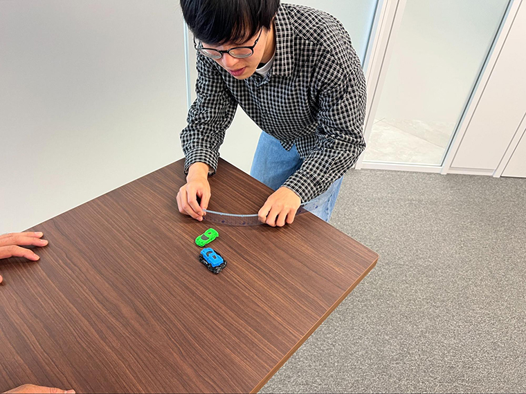 2つめはスーパーカー消しゴム相撲です。スーパーカー消しゴムを定規で弾いて相手の車にぶつけ、相手を押し出したほうが勝ち!こちらはむしろ、摩擦係数をあげてグリップ力を強くした方が有利かもしれません。