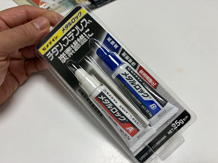 これがそのふたつである。エポキシ樹脂は固まるとかなりカチカチになるし、「メタルロック」もなんか硬そうだから摩擦係数が低いのではないかと思った。