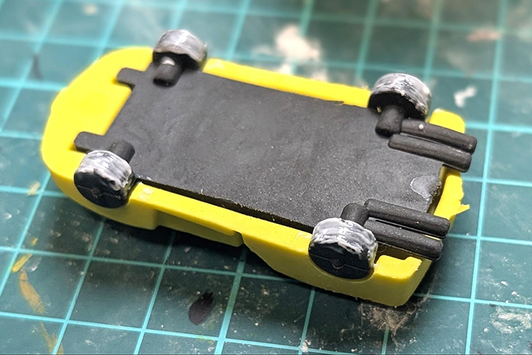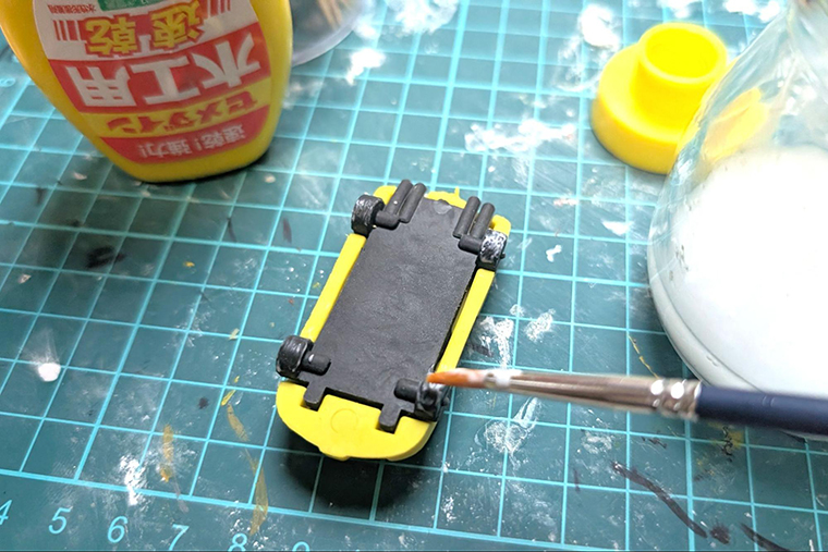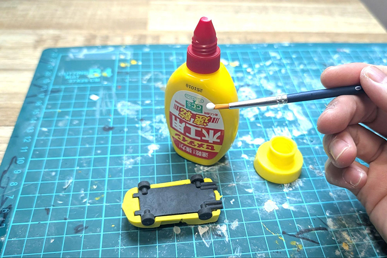 そこで、木工用接着剤を少量の水で溶いてから塗布。そうすることにより、水溶き木工用接着剤がいい感じの膜(まく)を作り、タイヤ表面を滑らかにすることに成功。