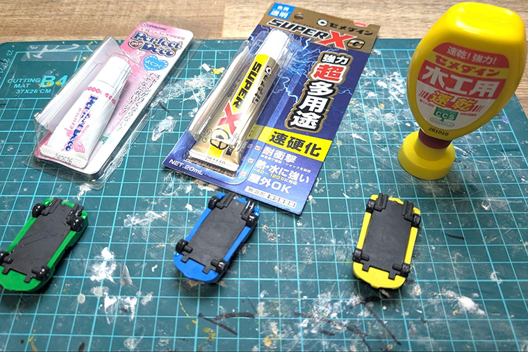 というわけでなんだか知らないけど、「スーパーカー消しゴムを接着剤で改造して対決で勝て」というよくわからないミッションを受けることになった。なので改造に使う接着剤を選ばなくてはいけない。