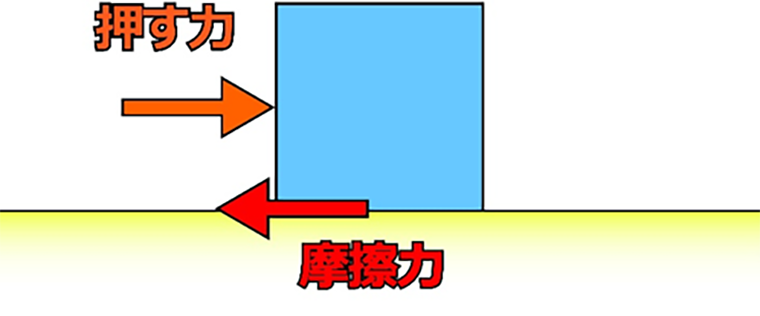 図からもわかる通り、押す力に対して逆向きにかかるのが摩擦力だ。ではなぜ、このような力が生じるのか、それには物体と床面の接触面で何が起こっているのかをミクロの世界で知る必要がある。