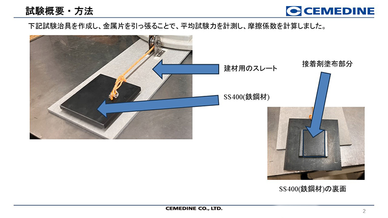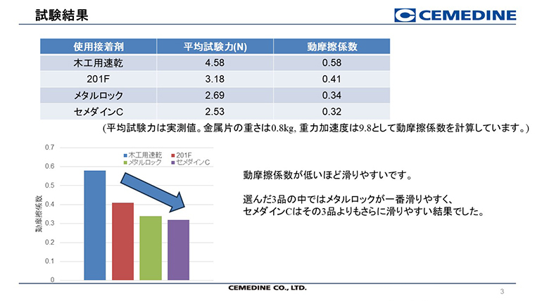 ちなみに、今回我々が制作したマシンに使用した接着剤、セメダインが摩擦係数を測ってくれました。その結果を見てみましょう。
