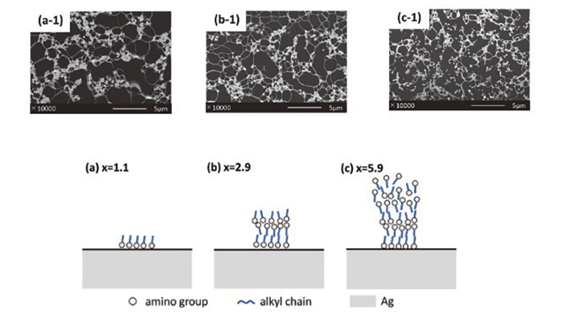 そこで、製造時のアルキルアミン濃度によってナノ銀フィラーと2つの相の親和性がどのように変化するかを、ハンセン溶解度パラメータ(HSP)を用いて評価しました。その結果、製造時のアルキルアミン濃度の増加につれて、ナノ銀フィラーと親和性の高い相がPnBA相→エポキシリッチ相→PnBA相→エポキシリッチ相と交代することが示唆されました。一方、ナノ銀フィラーの表面を覆っているアルキルアミンの分子数を求めたところ、製造時のアルキルアミン濃度の増加につれて分子層の数が増えることが示唆されました。これらの結果から、アルキルアミンの層が積み重なるときに分子の向きが交互に変わる(図7下段)ことで、親和性の高い相が交代したのだろうと推測しました。