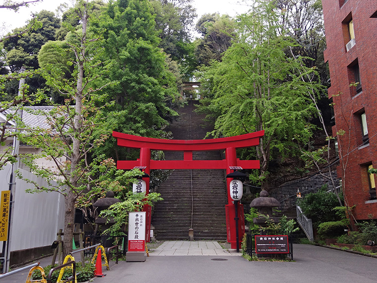 港区愛宕の愛宕神社は標高約26mの小さな丘の上にあるが、この丘は武蔵野台地の東端部にあたり、階段下は新橋や海のほうまで平坦な場所になっている。社殿はその平坦地から急な石段を上った先に控えている。現在は自動車が通れる坂があるし、エレベーターでも山上まで上れるが、やはりそこは江戸時代からある「男坂」(または「女坂」)で上ってみたい。20mほどの高低差でしかないが、男坂の86段の急な石段を上りきるとやはりちょっとした疲労感と達成感が得られ、少し徳を積んだような手応えもある。それは聖域へアプローチする際の儀式、手順を踏んだことにより得られる感覚だろう。周辺には超高層ビルが建ち並ぶが、山上の一角だけはいつも静謐な空間が保たれている。