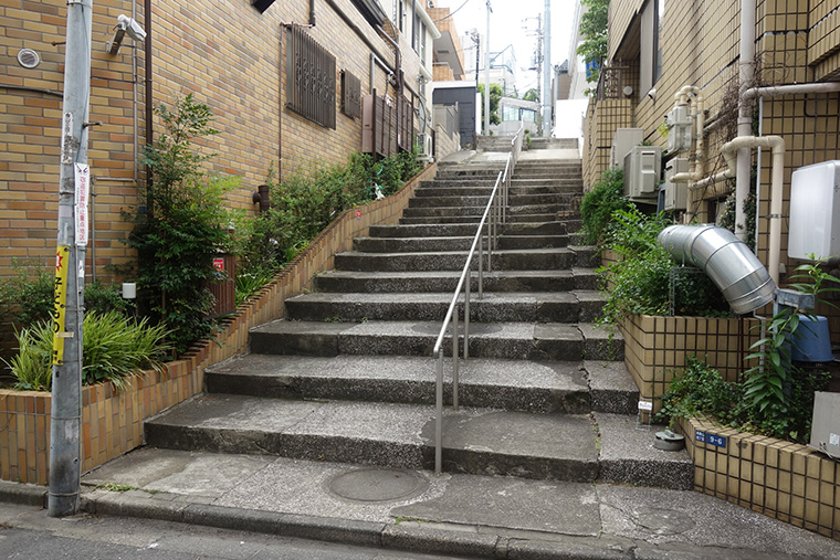 考えてみれば、静岡では階段は市街地とその周辺の山との境、際(キワ)に位置している。賑やかな空間とそうでない空間との境でそれを明確にしている装置ともいえよう。一方、東京の山の手では、階段は低地側の街と高台上の街の境にあるもので、こちらは同じ市街地の中で高台エリアと低地エリアを分けるものになっている。