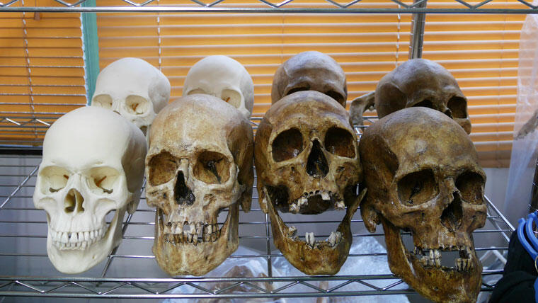 ちなみにおふたりの後ろにずらっと並ぶのが、今まで手掛けた演者さんたちの顔型です。デスマスク……! ではなく、生きている人の顔の型を取ったものは「ライフマスク」と呼ばれるらしいです。