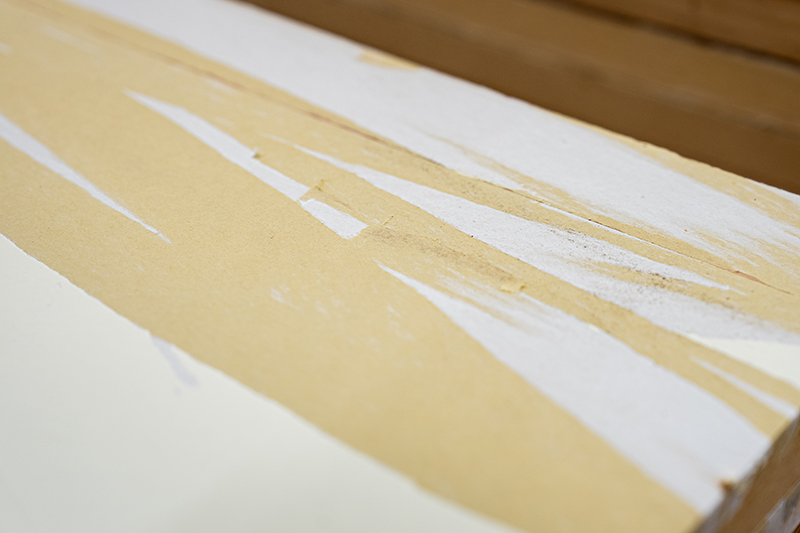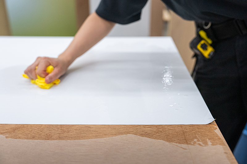 LOOPGLUEでは、水できれいに剥がせて使用後の木工パネルは新品同様の状態となる