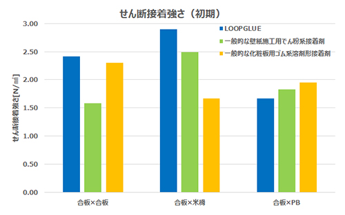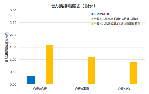通常の使用環境下では一般的な壁紙用でん粉系接着剤、化粧板用ゴム系溶剤形接着剤と同等以上の接着強さを示しながら、水によって簡単にはがすことができます。